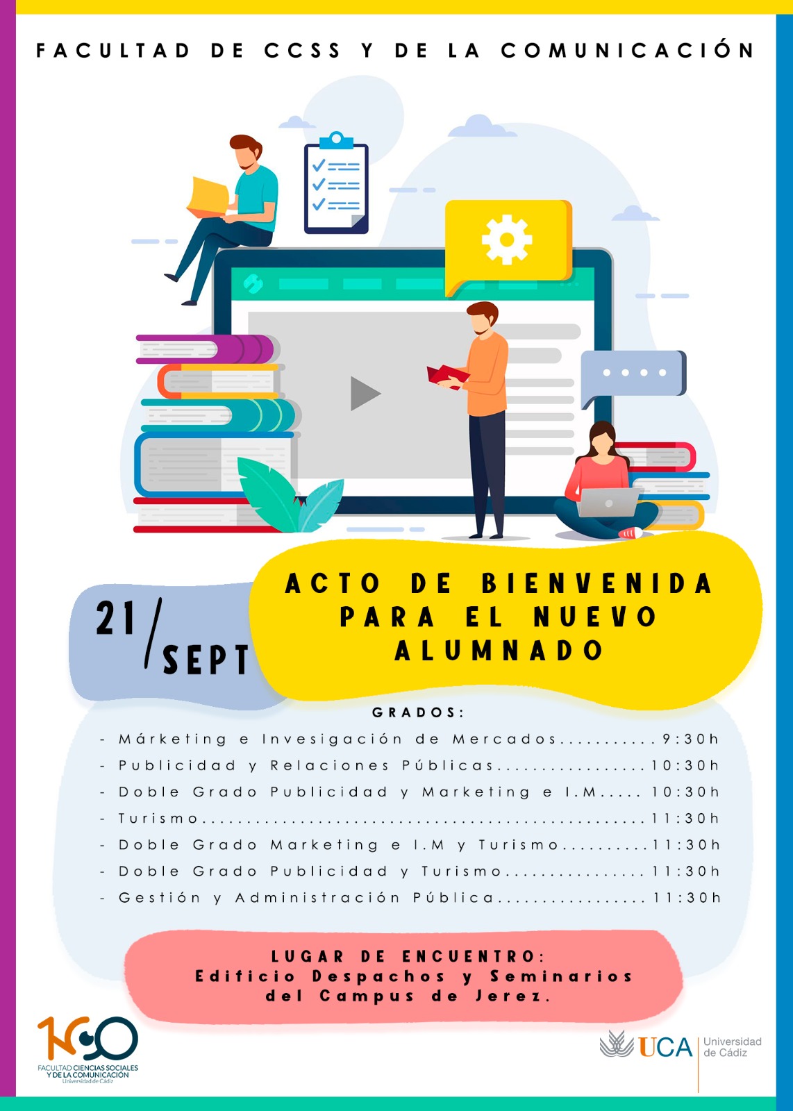 El próximo día 21 de septiembre tendrá lugar en el Salón de Actos (Edificio de Despachos y Seminarios) el Acto de Bienvenida para los alumnos de nuevo ingreso de Títulos de Grado 2021 de la Facultad de Ciencias Sociales y de la Comunicación con la siguiente distribución horaria: