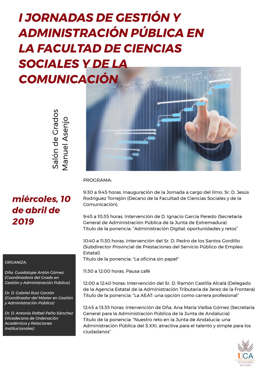 El miércoles día 10 de abril de 2019 se celebrará en el Campus de Jerez las I Jornadas de Gestión y Administración Pública en la Facultad de Ciencias Sociales y de la Comunicación en el Salón de Grados Manuel Asenjo (Edificio de Servicios Comunes), organizado por Dña. Guadalupe Antón Gómez (Coordinadora del Grado en Gestión y Administración Pública), Dr. D. Gabriel Ruiz Garzón (Coordinador del Máster en Gestión y Administración Pública) y Dr. D. Antonio Rafael Peña Sánchez (Vicedecano de Ordenación Académica y Relaciones Institucionales), profesores de la Facultad de Ciencias Sociales y de la Comunicación de la Universidad de Cádiz.