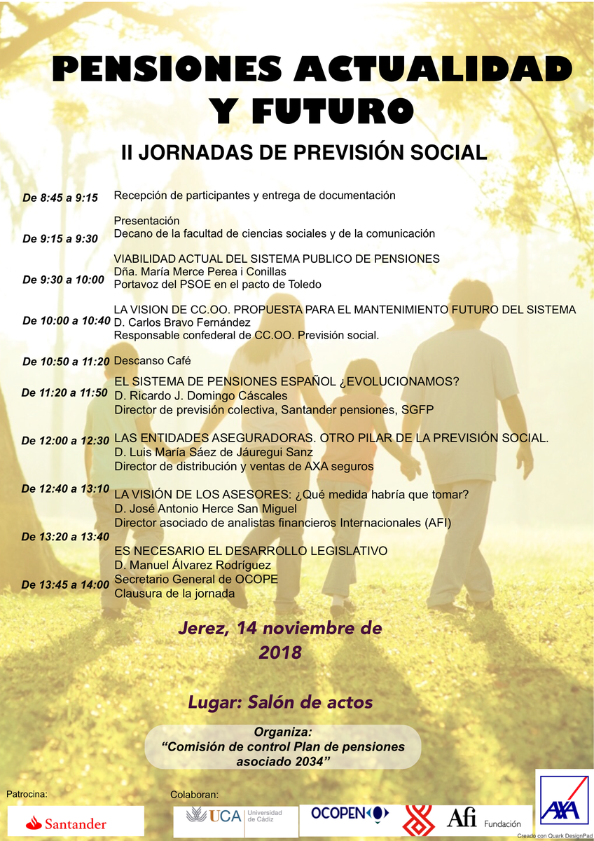 El próximo día 14 de noviembre, en el Salón de Actos de la Facultad de “Pensiones Actualidad y Futuro”Ciencias Sociales y de la Comunicación, celebramos la II Jornada de Previsión Social, titulada , organizada por la Asociación 2034, y en la que colabora nuestra Facultad.