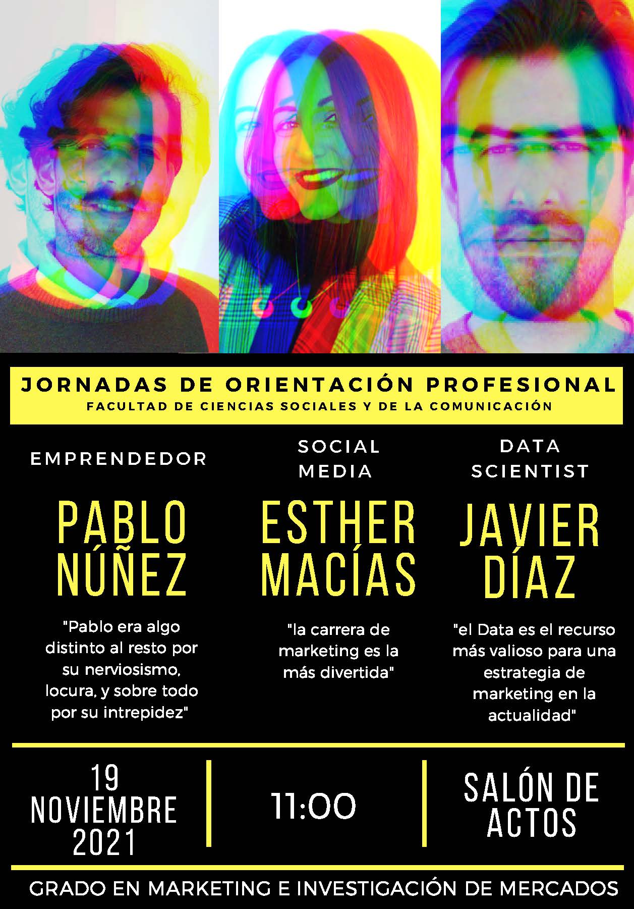 El próximo viernes 19 de noviembre tendrá lugar, a las 11 horas, en el Salón de Actos de la Facultad la Jornada de Orientación Profesional dirigida al alumnado del Grado en Marketing e Investigación de Mercados en la que participarán el emprendedor Pablo Núñez, la social media Esther Macías y el data scientist Javier Díaz.