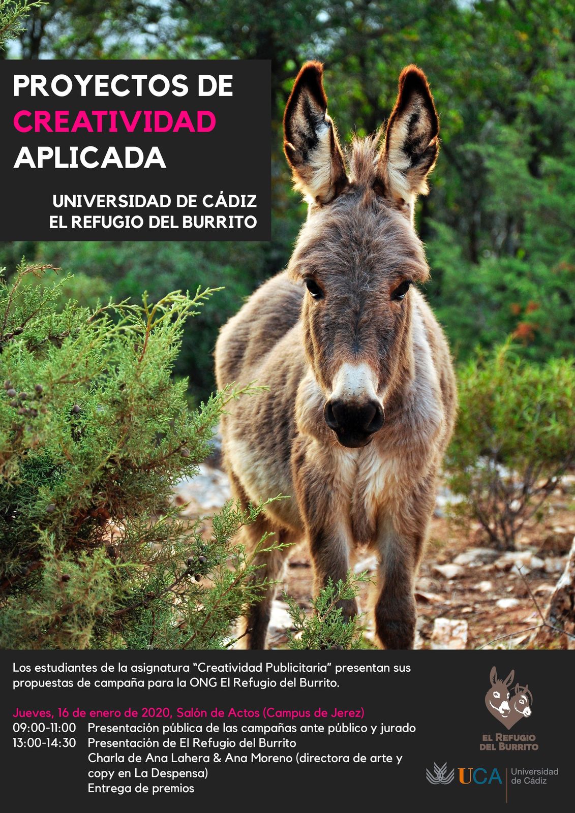 El jueves, 16 de enero de 2020, celebraremos un evento de presentación de las campañas publicitarias de fin social creadas por los estudiantes de la asignatura “Creatividad Publicitaria” del Grado en Publicidad y Relaciones Públicas para El Refugio del Burrito, una ONG dedicada a la protección del burro.
