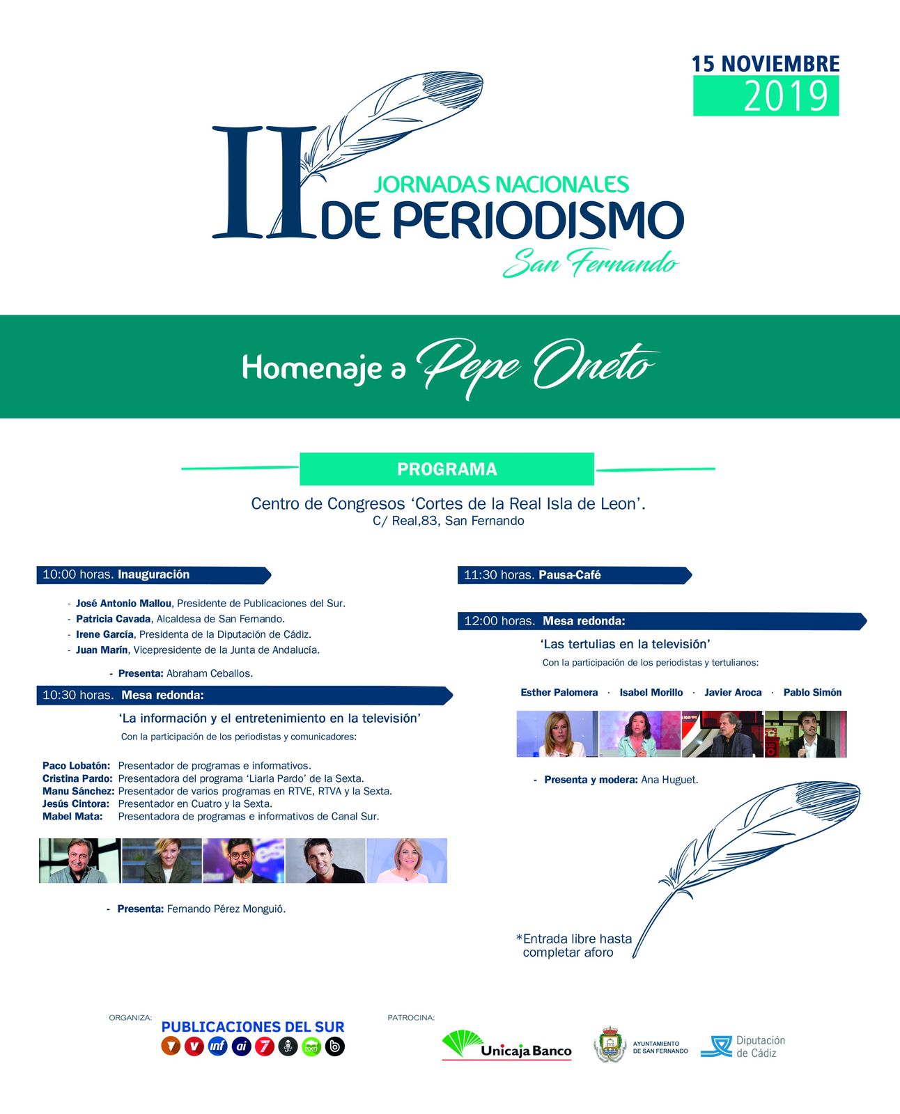 Las II Jornadas Nacionales de Periodismo se inaugurarán a las 10.00 horas en el Centro de Congresos. Al acto asistirán el vicepresidente de la Junta de Andalucía, Juan Marín, la alcaldesa de la ciudad, Patricia Cavada, la presidenta de la Diputación Provincial de Cádiz, Irene García, y el consejero delegado de Publicaciones del Sur, José Antonio Mallou.