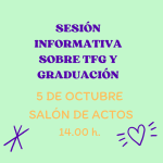 Se ha previsto una única sesión informativa el día 5 de octubre, en el salón de actos a las 14.00 h., para abordar el TFG y la graduación. A la misma, está previsto que asistan el coordinador de TFG del centro, Jaime Guerrero, el decano, la vicedecana de estudiantes y los 4 coordinadores de grado. Se presentará la plataforma de gestión del TFG (Xerry CCSociales), las tipologías de TFG, el calendario de asignación de tutores/as de Trabajos de Fin de Grado y las fechas de entrega y defensa del TFG en las diferentes convocatorias del curso 23/24. Finalmente, se informará del lugar de celebración y la fecha de la graduación, fijada para el 27 de junio, así como de los plazos y requisitos para la inscripción.