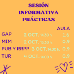 El coordinador de prácticas de la Facultad, el profesor José María de Pablos, tendrá una sesión con cada grado, los días 2 (GAP y MIM),3 (PUB) y 4 (TUR), para resolver las dudas concretas en relación a los perfiles formativos de cada título, además de abordar la normativa relevante, las modalidades de prácticas, los procedimientos, la importancia del proyecto formativo o el uso y gestión por parte del alumnado de la plataforma Gades.