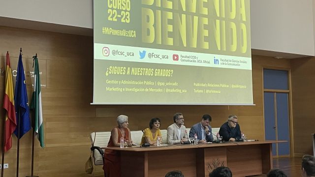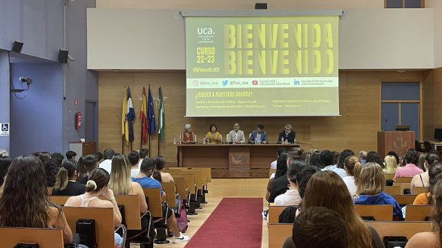 El miércoles 21 de septiembre tuvo lugar el acto de inauguración de curso para nuevos alumnos de la Facultad de Ciencias Sociales y de la Comunicación. Celebrado en el salón de actos del campus de Jerez, se dividió en dos tandas de horarios en función de las distintas titulaciones. A las 10:00 de la mañana se recibió al alumnado del Grado en Publicidad y Relaciones Públicas, Grado en Turismo, así como las dobles titulaciones Grado en Publicidad y Turismo o Grado en Publicidad y Marketing; y a las 11:00 al alumnado del Grado en Marketing, Grado en Gestión y Administración Pública y del doble Grado en Marketing y Turismo.