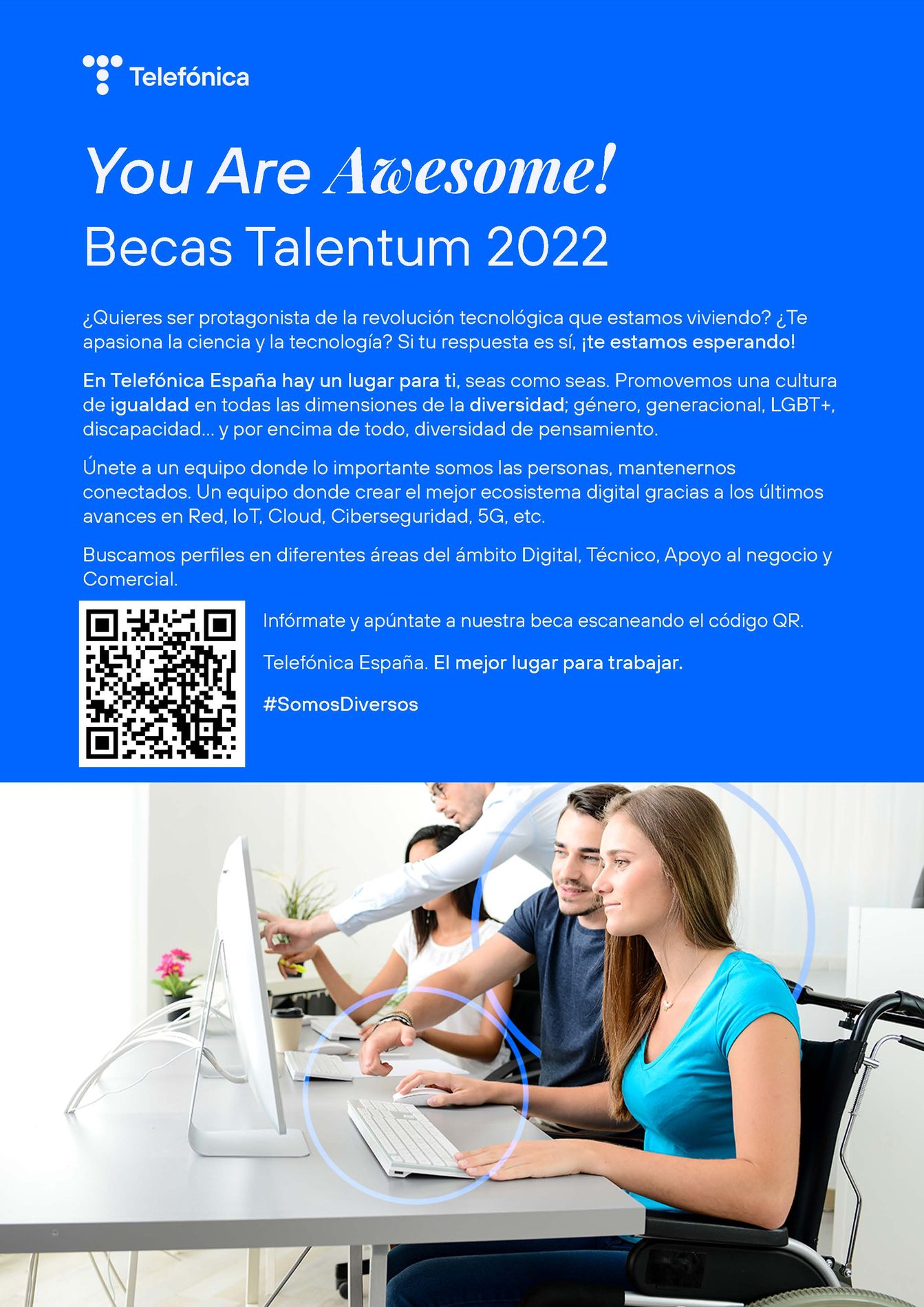 La Fundación SEPI y Telefónica convocan un año más las Becas Talentum cuyo objetivo es facilitar los períodos de formación práctica a jóvenes universitarios con un máximo pendiente de 30 créditos ECTS por aprobar. Esta actividad práctica, como becarios y becarias se desarrolla en los centros de trabajo de Telefónica bajo la supervisión de tutores o tutoras y tiene una duración inicial de seis meses desde la fecha de incorporación, contemplada para el 1 de julio de 2022.